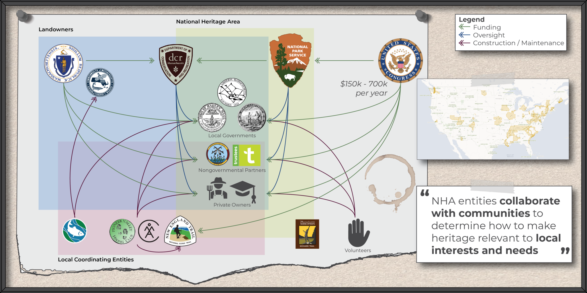 This project proposes a National Heritage Area spanning from Chicopee to Hatfield and from Southampton to the Quabbin Reservoir, encompassing roughly 335 square miles. In this structure, “partners” – local governments, nonprofits, and businesses – receive state and federal funding, and direction and oversight from the NPS, while the work is done by volunteers and private landowners. Learn more about NHAs here.