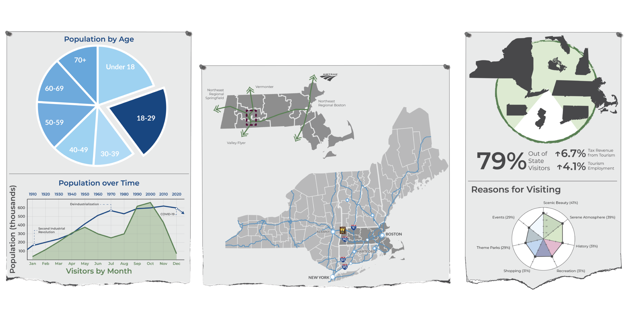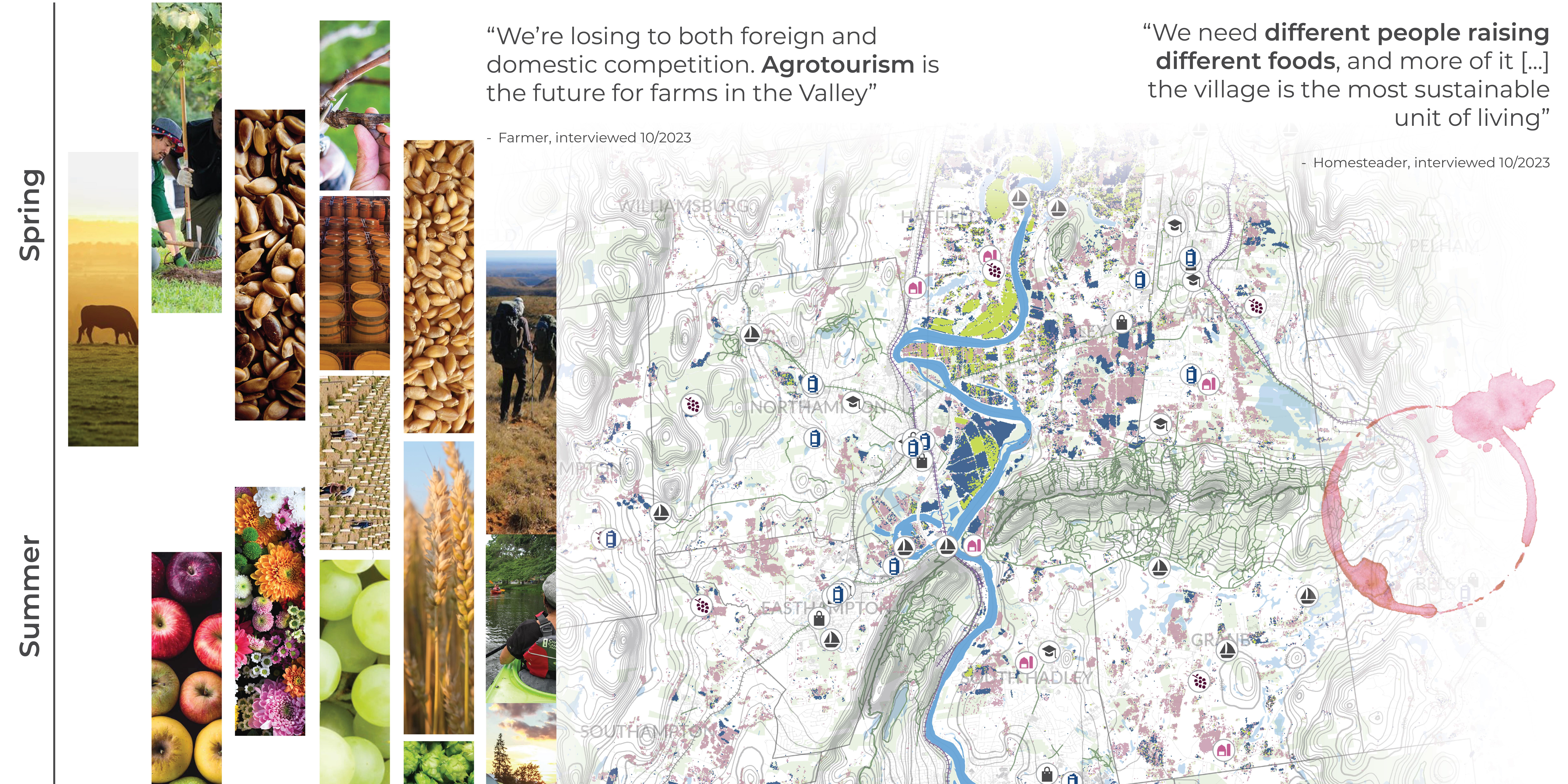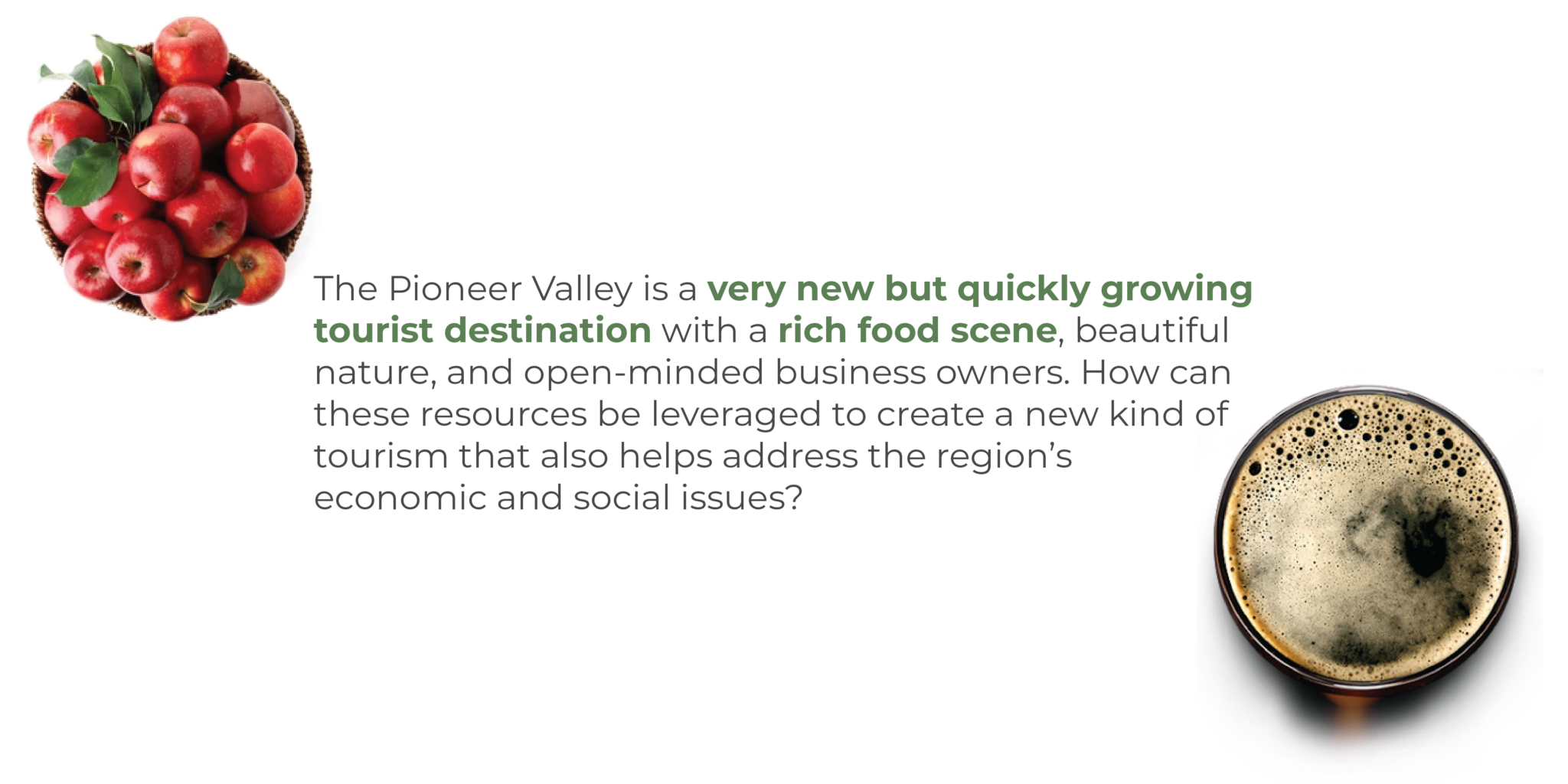 Extensive research into the Pioneer Valley, including on-the-ground analysis and interviews with various stakeholders including farmers, residents, and small business owners, provided insights on the priorities, problems, and assets of the region. Assets include its natural beauty, diversity of food and drink, small but growing tourism sector, and tight-knit farming communities, while some challenges it faces are an aging and declining population, struggling economies, and the farmers’ desire to diversify business. Leveraging all of these, the Pioneer Valley is poised to create an enticing, sustainable, and unique set of draws for tourists that can also help to keep farms afloat, provide them alternative streams of income, and tangibly and directly benefit local communities.