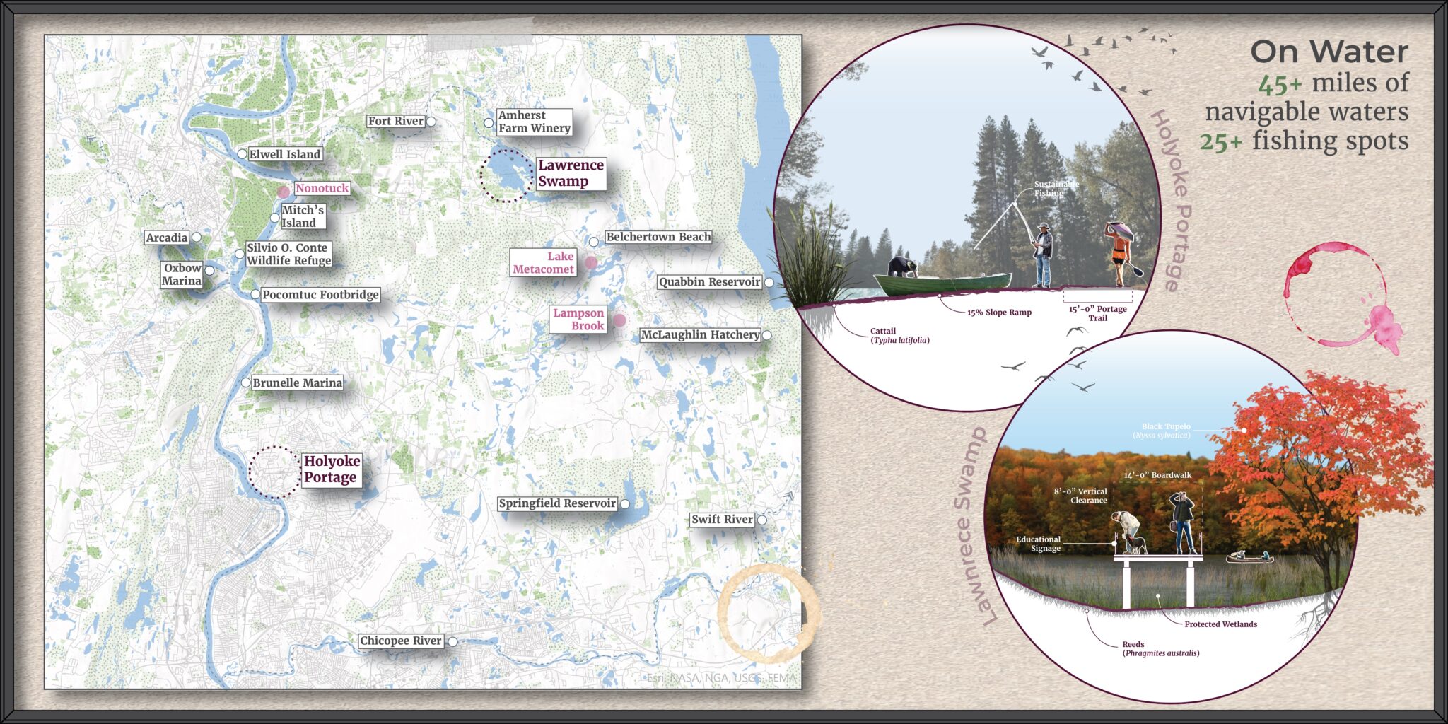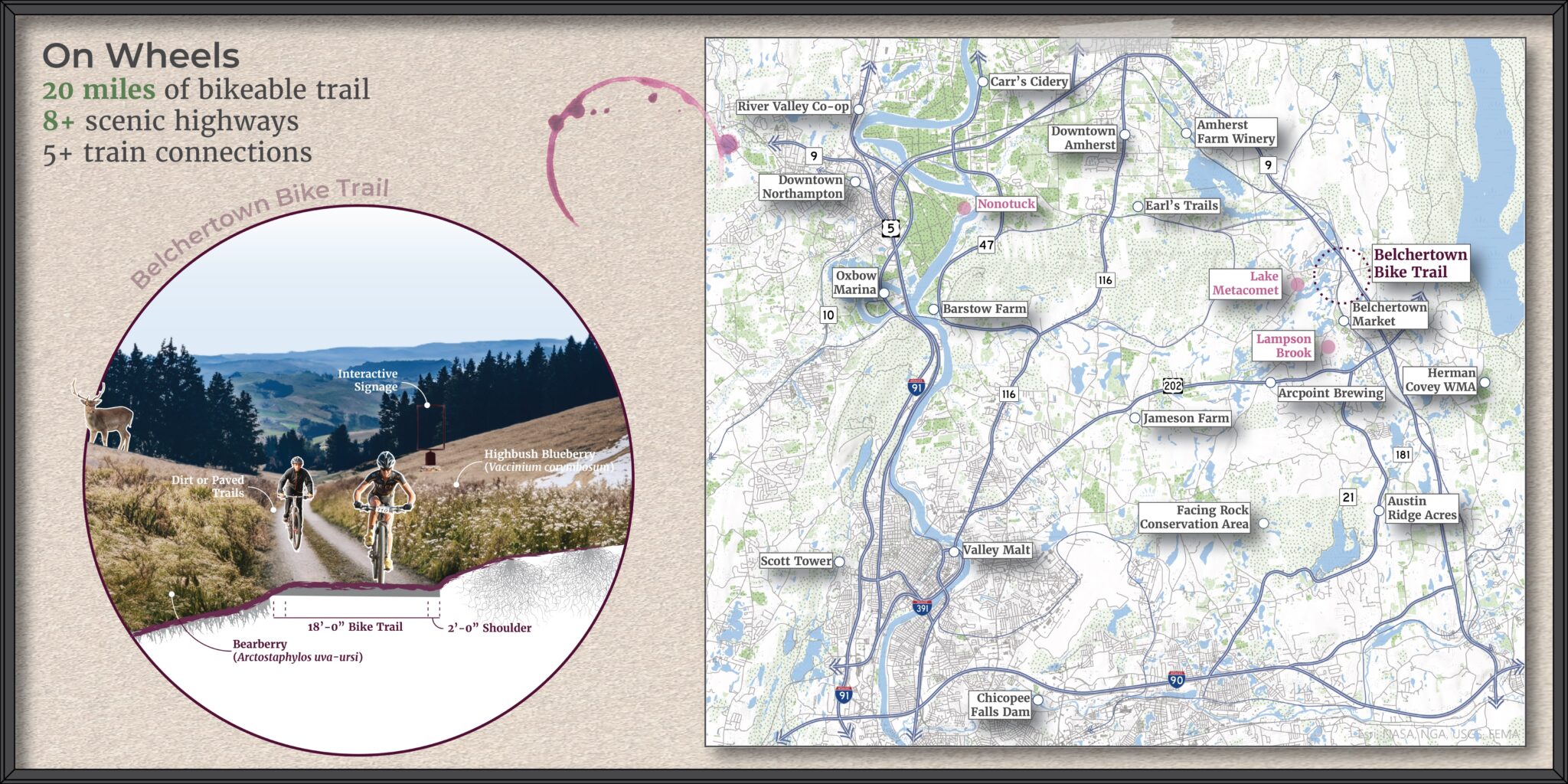 In addition to the many small interventions and existing businesses and parks along the Trails, there are also three locations that serve as major destinations, or hubs. The Oxbow Shellfish Docks, Amherst Farm Winery, and Belchertown Charcuterie all exemplify the unique blend of local food, culture, nature, and recreation that make this NHA special, and promote interaction between residents and tourists through a share experience that caters to a diverse set of needs.
