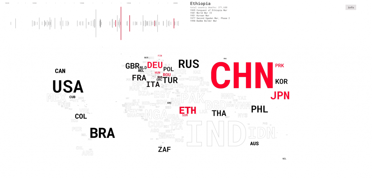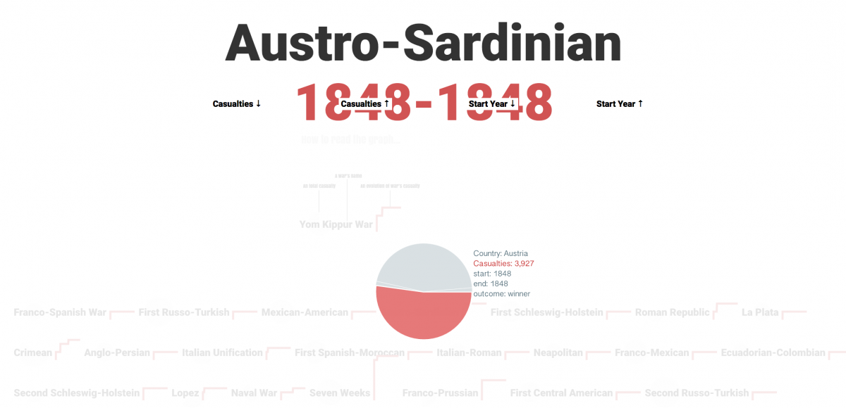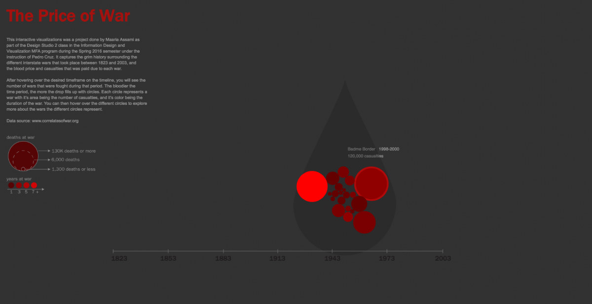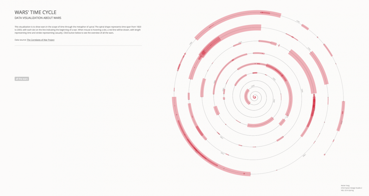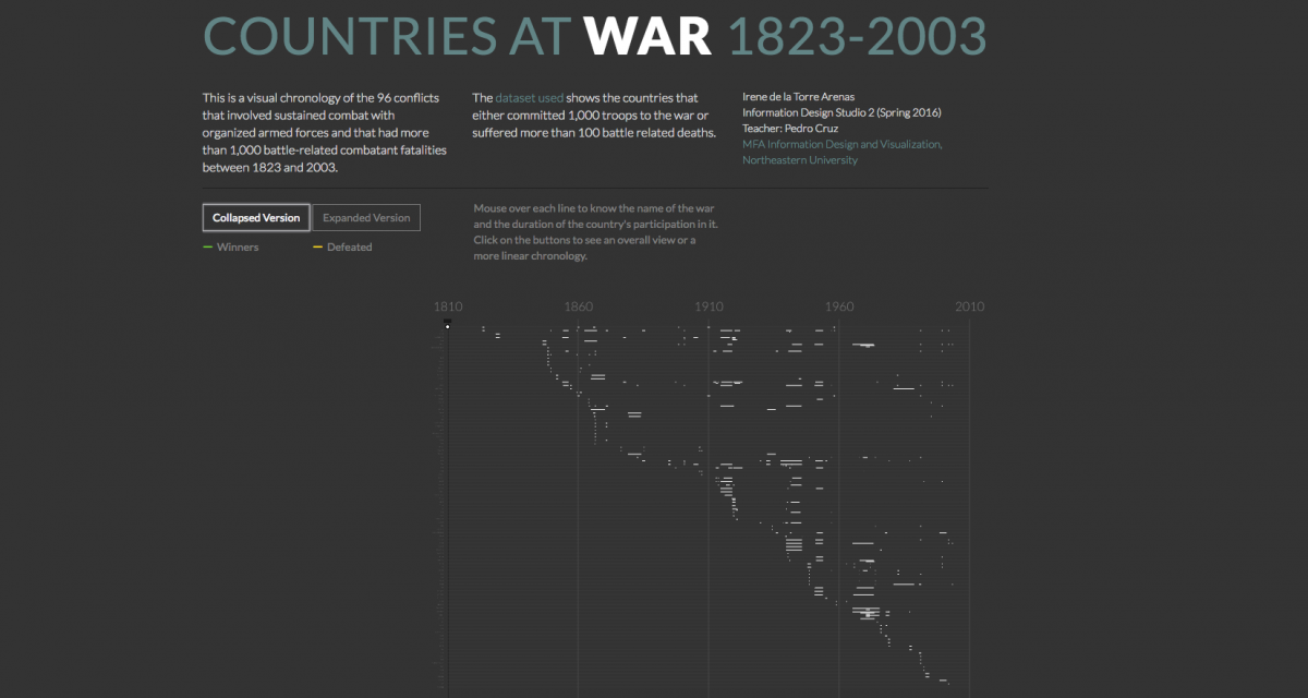 The Correlates of War Project (http://www.correlatesofwar.org) provides data of militarized conflicts throughout the last 200 years. In this design studio, students were asked to build an interactive vsualization to answer questions such as: