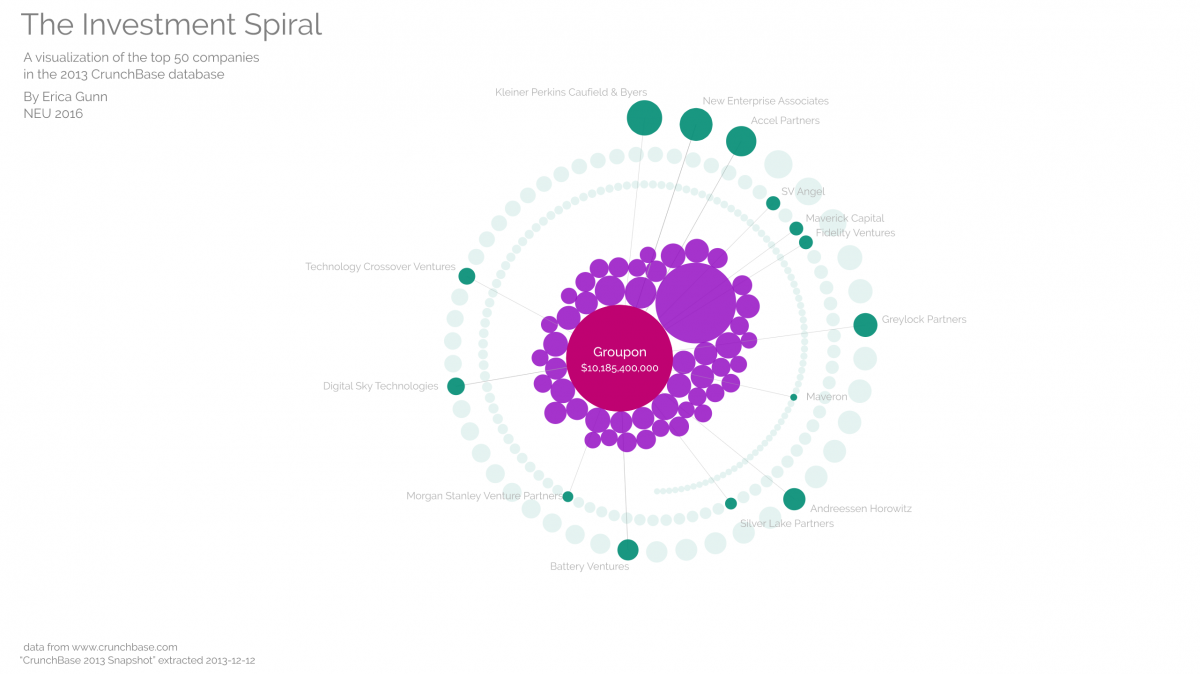 The Crunchbase data set provides information on major venture capital investments since 2007. In this course, students were asked to visualize this network of relations by building an interactive application for the web. They used p5.js, and used several physics-inspired techniques implemented from scratch. The projects showed here are a short selection of the projects developed in class.