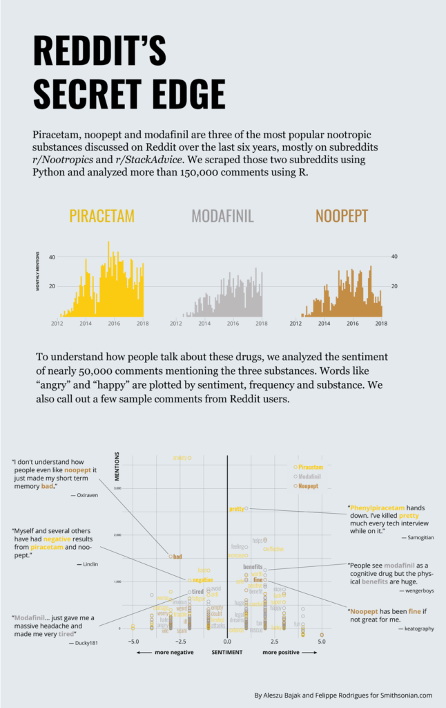 We wanted to see what happens to these substances after they’ve had been booted from the Olympics, so we took to Reddit. By analyzing 150,000 Reddit comments, we found that these same stimulants are now openly discussed on forums about recreational drugs and tech, with people trading tips on where to buy them (usually on dubiously legal websites), their effects, and their traceability. We focused on piracetam, modafinil, and noopept, three Nootropics that are some of the most-talked-about on Reddit and are widely marketed in the U.S.