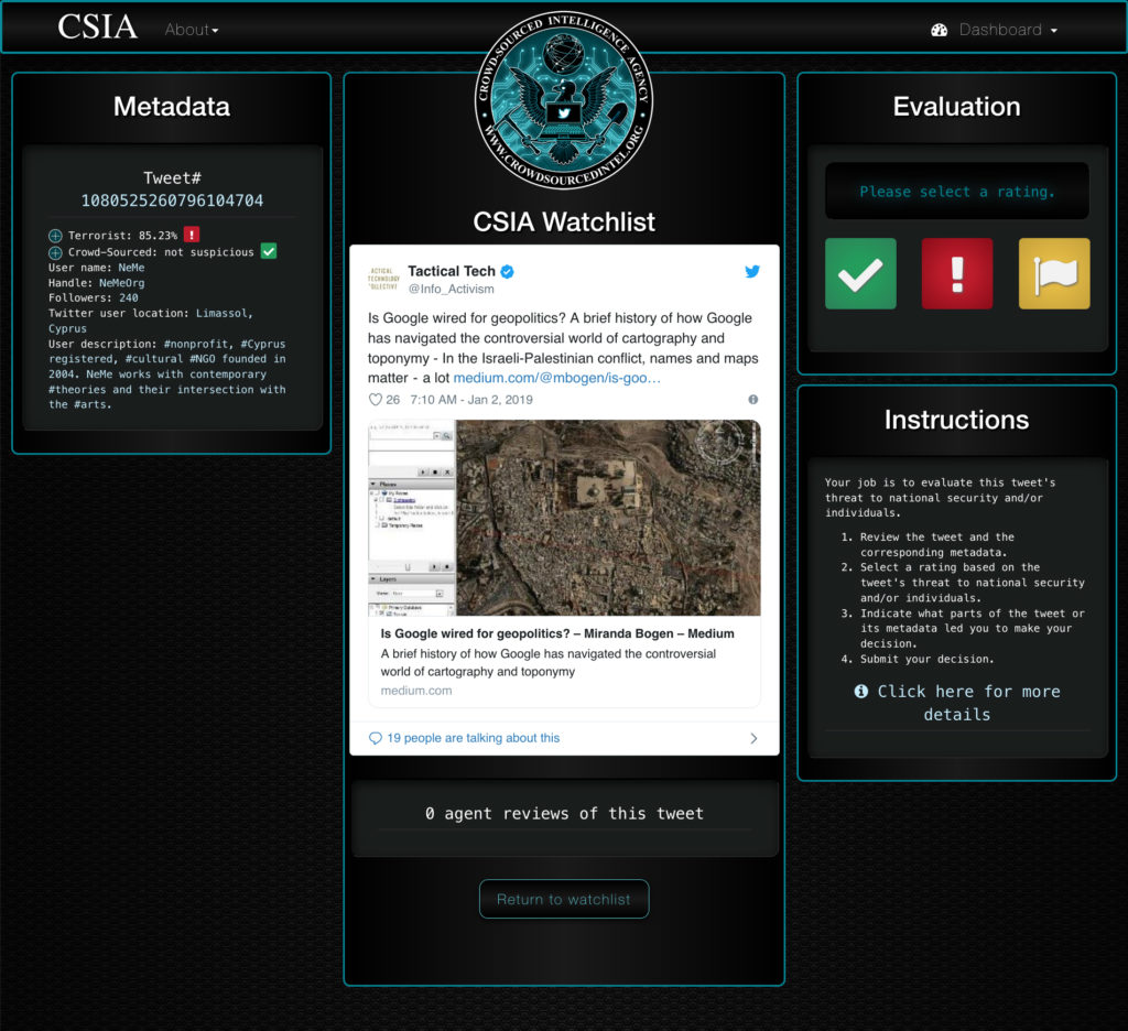 Recent innovations to Curry and Gradecki’s CSIA project have included adding two new machine-learning classifiers, one trained on posts made from Twitter accounts of known terrorist organizations (including ISIS and Boko Haram) and the other trained on the Twitter accounts of intelligence agencies (including the FBI, CIA, and Government Communications Headquarters).