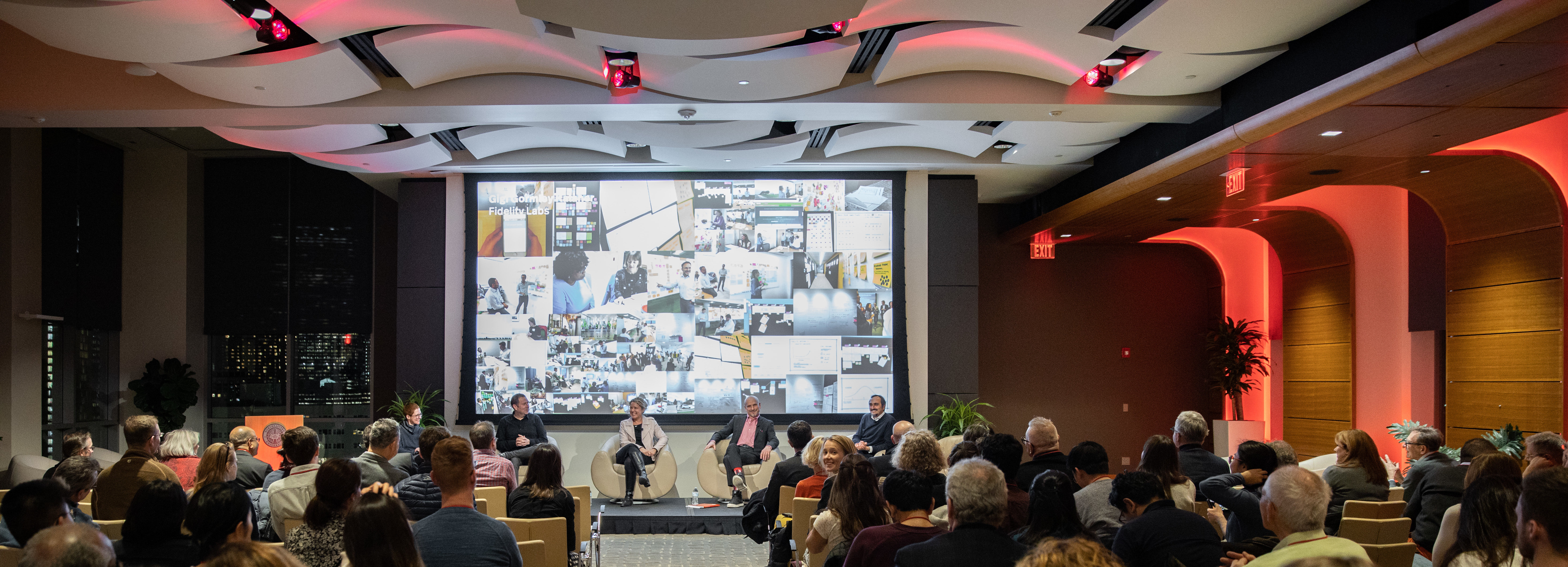 After Lupi’s keynote presentation, panelists Ari Adler (IDEO), Gigi Gromley Kalaher (Fidelity labs), and Jeffrey Schnapp (Piaggio Fast Forward and Harvard University) were introduced to the stage by CAMD Dean Elizabeth Hudson. The four joined Lupi in a panel discussion about the challenges that design faces when it comes to new technology, such as Artificial Intelligence, and whether or not design is robot-proof.